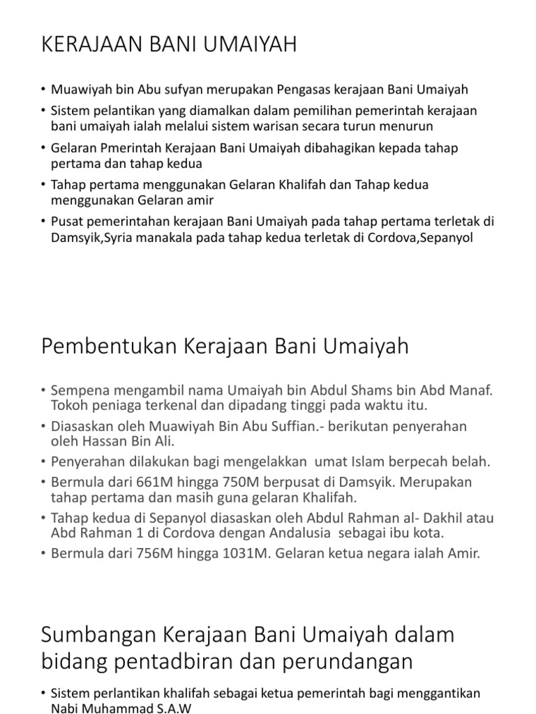 Dinasti ini didirikan oleh muawiyyah bin abi sufyan. Khalifah abbasiyah mempunyai kepemimpinan yang kuat. Bani ummayah merupakan pemerintahan islam yang pertama kali menggunakan pola dinasti atau kerajaan. Ahli sejarah membagi perkembangan bani abasiyah menjadi lima tahap 10. Politik i sistem pemerintahan dan sistem pentadbiran terbahagi kepada empat aspek f3 dikenakan cukai yang tinggi.